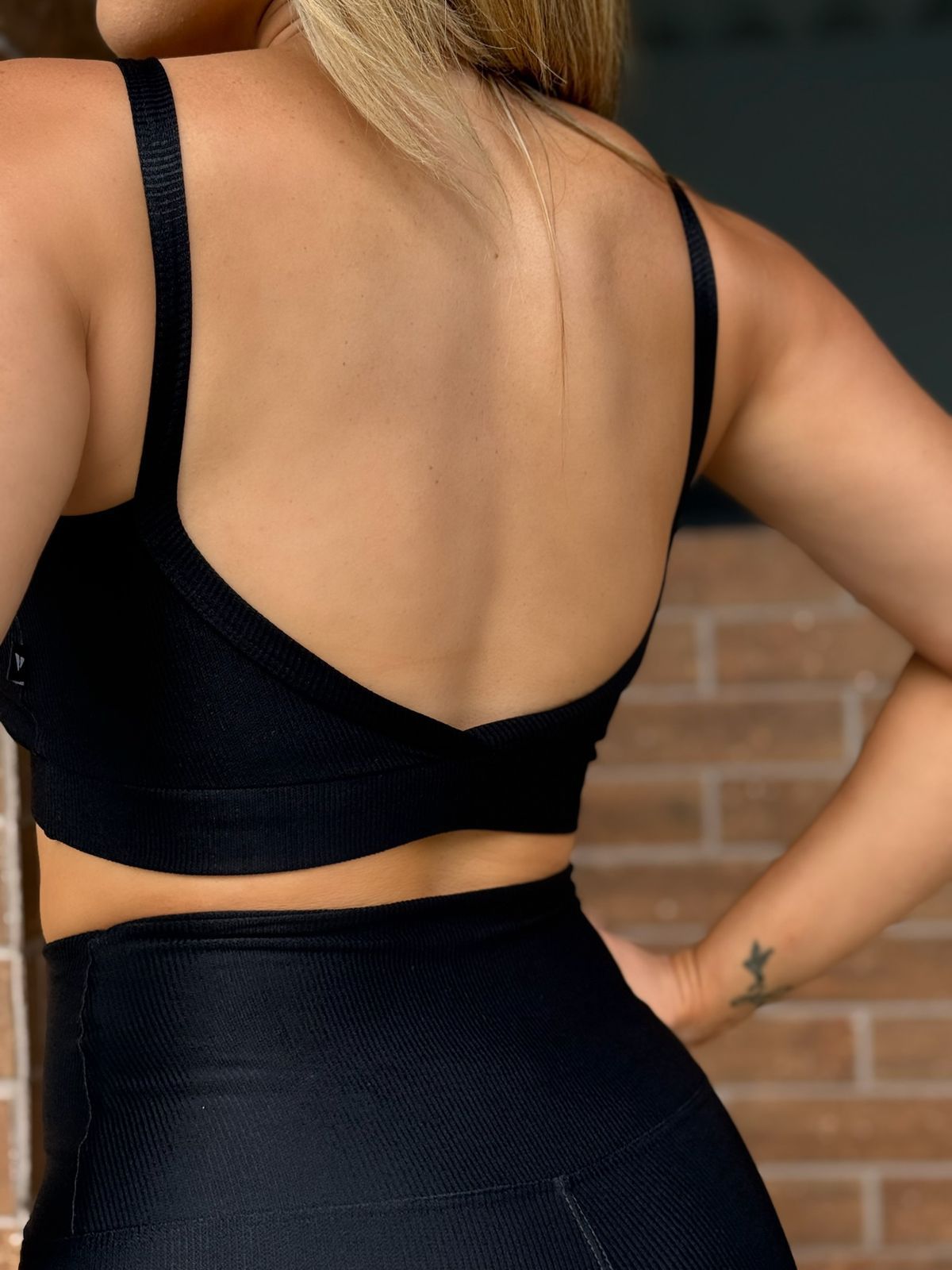 Possui alças em frisos que formam um desenho em “V” nas costas e barra com elástico, garantindo firmeza e conforto.